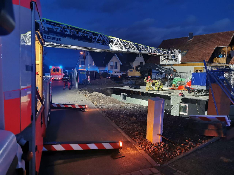 Eine abgestürzte Person in einem Neubau wurde mittels Drehleiter patientengerecht aus dem Keller gerettet.