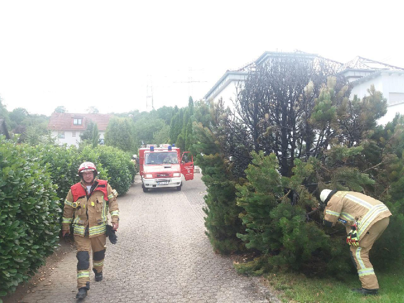 Vor Ort zeigte sich, dass die Anwohner bereits tatkräftig den brennenden Baum in Hausnähe mit dem Gartenschlauch gelöscht hatten.