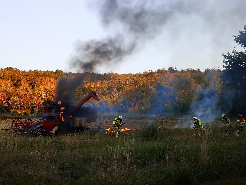 Sehr schnell wurde ausgerückt, vor Ort zeigte sich ein brennender Mähdrescher und davon ausbreitender Flächenbrand.