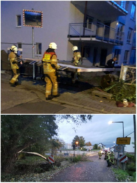 Umgestürztes Baustellenschild auf der Weißenthurmer Straße und abgestürzter Ast auf Fahrbahn und Bachlauf in der Bassenheimer Straße.