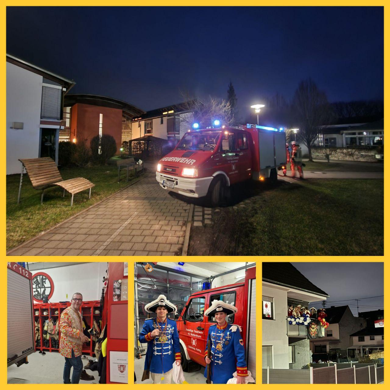 Die zum Teil kostümierten Wehrleute eilten ins Gerätehaus und rückten entlang der am Hotel Kaiser stehenden Garden/Funken in die Anne-Frank-Straße aus.